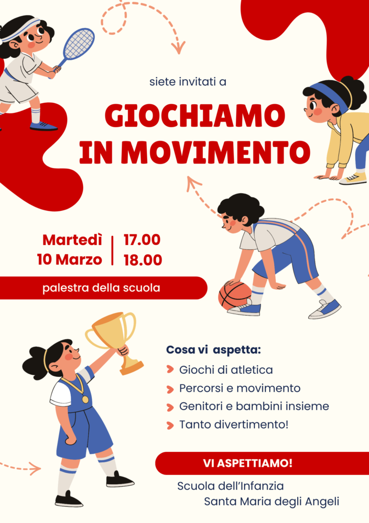 Martedì 10 marzo 2026, dalle ore 17.00 alle 18.00, la palestra della Scuola dell’Infanzia Santa Maria degli Angeli ospiterà “Giochiamo in Movimento”, un evento di gioco-atletica dedicato ai bambini e alle loro famiglie.